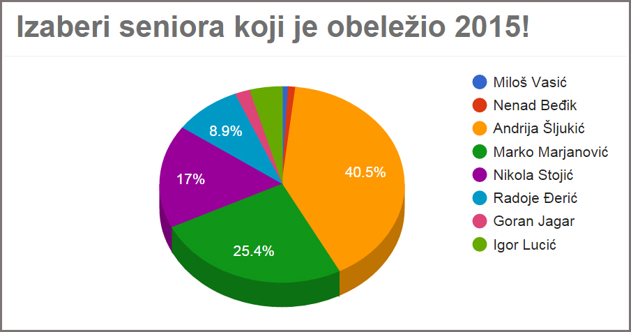 U utorak, 10. novembra 2015, završeno je glasanje u anketi „Izaberi seniora koji je obeležio 2015!“. U uži krug je ušlo osam veslača, a po mišljenju posetioca našeg sajta Andrija šljukić obeležio ovu godinu. On je dobio 428 glasova. šljukić je u 2015. izlio šest medalja, od toga pet zlatnih i jednu srebrnu. Osvojio je zlata u skifu na Internacionalnoj regati „Croatia Open“ u Zagrebu, Beogradskoj internacionalnoj regati – Trofeju Beograda u Beogradu, na Internacionalnoj regati "Vojvodina Open" na Paliću i na Prvenstvu Srbije u Beogradu, na kojem je osvojio i najsjajnije odličje u dubl skulu. Takođe, postao je vicešampion u skifu na Svetskom prvenstvu za seniore do 23 godine u Plovdivu.