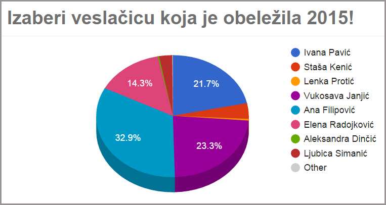 U sredu, 25. novembra 2015, završeno je glasanje u anketi „Izaberi veslačicu koja je obeležila 2015!“. U uži krug je ušlo devet veslačica, a po mišljenju posetioca našeg sajta Ana Filipović obeležila je ovu godinu. Ona je dobila 237 glasova. Filipovićeva je u 2015. izlila šest odličja, od toga jedno zlatno, tri srebrna i dva bronzana.