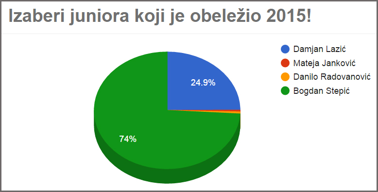 U nedelju, 1. novembra 2015, završeno je glasanje u anketi „Izaberi juniora koji je obeležio 2015!“. U uži krug je ušlo četiri veslača, a po mišljenju posetioca našeg sajta Bogan Stepić obeležio je ovu godinu. On je dobio 3066 glasova. Stepić je u 2015. izlio pet odličja, od toga tri zlatna i dva bronzana. Osvojio je bronza u četverac skulu na Internacionalnoj regati „Croatia Open“ u Zagrebu, zlata u skifu i četverac skulu na Internacionalnoj regati "Vojvodina Open" na Paliću, zlato u dubl skulu na Prvenstvu Srbije u Beogradu i bronzu u četverac skulu na istom takmičenju. Bio je četvrti u dubl sklulu na Balkanskom prvenstvu u Jašiju i peti u četvercu sa kormilarom na Evropskom prvenstvu za juniore u Račicama. Na drugom mestu je Damjan Lazić s 1032, na trećem Danilo Radovanović s 23, a na četvrtom Matija Janković s 20 glasova.