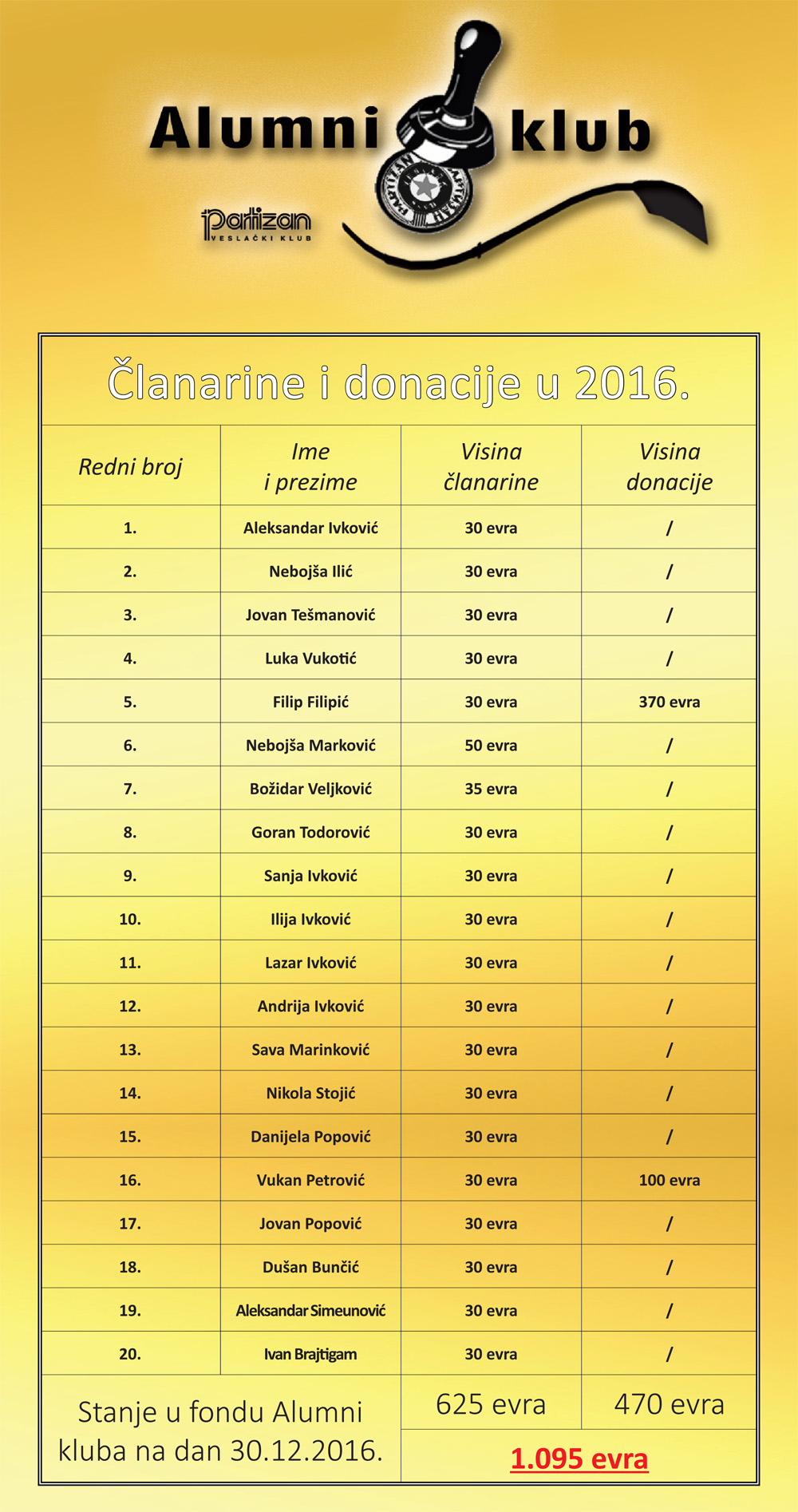 Alumni klub Veslačkog kluba Partizan je od njegovog osnivanja, maja 2016, zaključno sa 30. decembrom ove godine, u svoj fond prikupio 1.095 evra. S željom da redovno informišemo o uplatama i stanju fonda Alumni kluba na našem sajtu otvorili smo posebnu stranicu na kojoj će biti evidentirana svaka promena. Nju možete pogledati OVDE