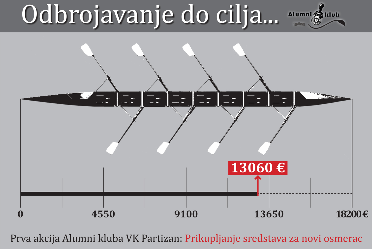 U Fond Alumni kluba VK Partizan slile su se još dve uplate. Sa po 30 evra Miraša Obradovića i Miloša Bučevca Fond Alumni kluba stigao je do cifre 3.960 evra, pa je tako, do isplate za novog osmerca ostalo svega 5.140 evra. Podsećanja radi Klub iz sopstvenih prihoda i uz pomoć donacija isplatio 9.100 evra, tj. polovinu od ukupne sume od 18.200 evra, za koliko je, uz veliki popust, nabavljen osmerac. Novi osmerac će, ujedno, nositi obeležja Alumni kluba VK Partizan kao svedočanstvo ogromne energije, želje i motiva svih članova da daju, svako na svoj način, nemerljiv doprinos uspehu ideje donatorstva kao jednog od načina za razvoj i napredak novih generacija šampiona. Takođe, ovom prilikom pozivamo sve zainteresovane da daju svoj predlog za znanično ime novog osmeraca pod kojim će ploviti domaćim i međunarodnim veslačkim stazama. Predloge možete poslati na e-mail veslackiklubpartizan@gmail.com do 1. marta 2017. Nakon toga ćemo organizovati glasanje putem našeg sajta i facebook profila, a predlog koji bude dobio najviše glasova biće pobednički.
