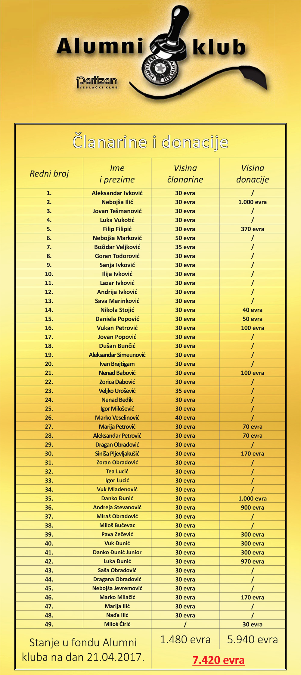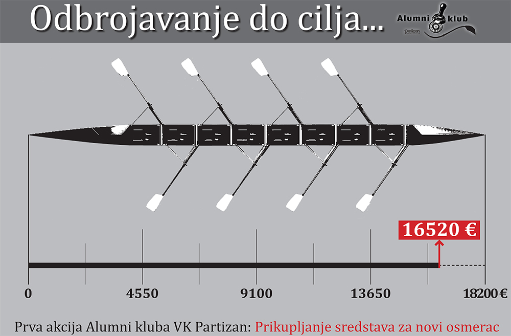 Zahvaljujući donaciji u visini od čak 1.000 evra, koju je u Fond Alumni kluba VK Partizan uplatio šef stručnog štaba našeg Kluba Nebojša Ilić, stigli smo do cifre od 7.420 evra koja će kompletno biti iskorišćena za ispaltu novog osmerca, prvog nakon tri decenije. Za tako nešto ostalo nam je da se prikupi još oko 9% od ukupne sume, tj. tačno 1.680 evra, a ovom prilikom Veslački klub Partizan se zahvaljuje svima koji su svojim uplatama dali doprinos prvoj akciji Alumni kluba VK Partizan i ujedno poziva sve ostale da se, ukoliko su u mogućnosti i ukoliko imaju želju, priključe ovoj akciji.