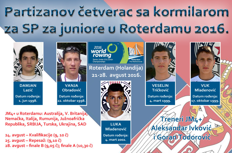 U nedelju, 21. avgusta 2016. u Roterdamu počinje Svetsko prvenstvo za seniore u neolimpijskim disciplinama, seniore do 23 godine i juniore koje će okupiti rekordnih 1.900 takmičara i takmičarki iz 80-tak zemalja. Čast Veslačkog kluba Partizan u Holandiji braniće juniorski četverac sa kormilarom Vuk Mladenović, Veselin Tričković, Vanja Obradović, Damjan Lazić, kormilar Luka Mladenović. Ovaj čamac, koji je 10. jula ove godine razgalio srca svih ljubitelja crno-bele boje vicešampionskom titulom na Evropskom prvenstvu u Trakaiju, pokušaće u Roterdamu da ostvari još jedan briljantan rezultat na međunarodnoj sceni i da donese našem klubu 36. medalju sa svetskih šampionata. U pohod na planetarno odličje Vuk Mladenović, Veselin Tričković, Vanja Obradović, Damjan Lazić i kormilar Luka Mladenović i njihov trener Goran Todorović kreću u ponedeljak. Istog dana stižu na poprište svetskog šampionata koji u juniorskoj konkurenciji startuje u sredu, 24. avgusta. Pred odlazak za Holandiju