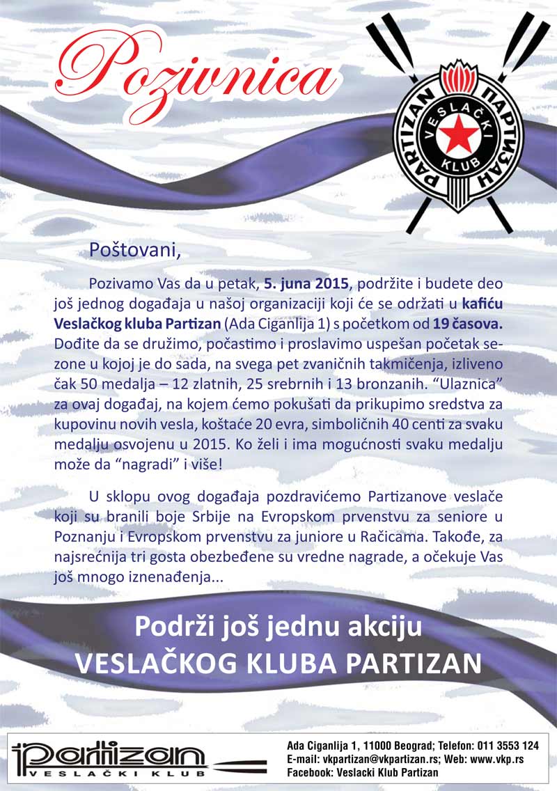 Pozivamo Vas da u petak, 5. juna 2015, podržite i budete deo još jednog događaja u našoj organizaciji koji će se održati u kafiću Veslačkog kluba Partizan (Ada Ciganlija 1) s početkom od 19 časova. Dođite da se družimo, počastimo i proslavimo uspešan početak sezone u kojoj je do sada, na svega pet zvaničnih takmičenja, izliveno čak 50 medalja – 12 zlatnih, 25 srebrnih i 13 bronzanih. “Ulaznica” za ovaj događaj, na kojem ćemo pokušati da prikupimo sredstva za kupovinu novih vesla, koštaće 20 evra, simboličnih 40 centi za svaku medalju osvojenu u 2015. Ko želi i ima mogućnosti svaku medalju može da “nagradi” i više! U sklopu ovog događaja pozdravićemo Partizanove veslače koji su branili boje Srbije na Evropskom prvenstvu za seniore u Poznanju i Evropskom prvenstvu za juniore u Račicama. Takođe, za najsrećnija tri gosta obezbeđene su vredne nagrade, a očekuje Vas još mnogo iznenađenja...