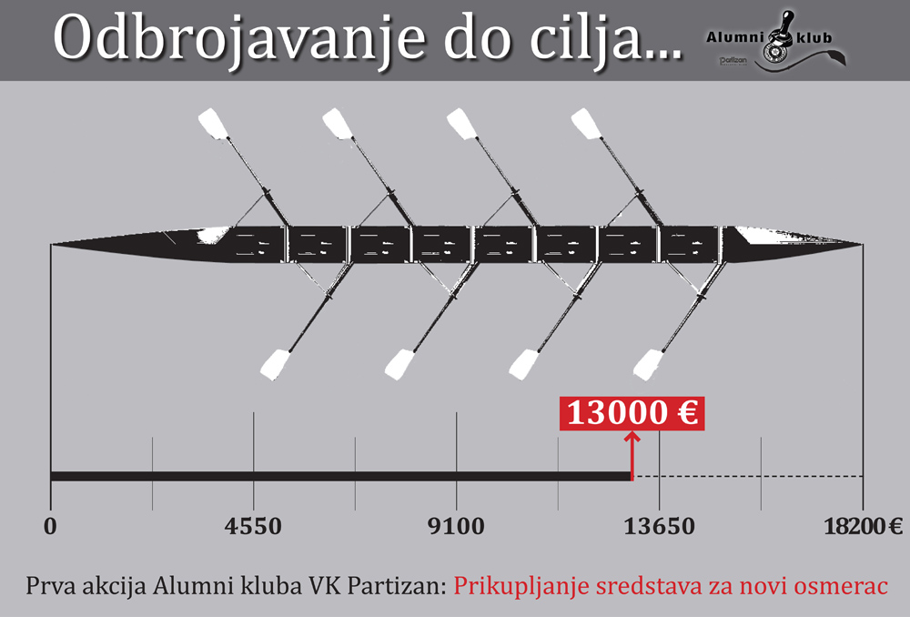 Zahvaljujući uplati članarine i donacije našeg bivšeg veslača Andreje Stevanovića u Fond Alumni kluba VK Partizan u ukupnom iznosu od 1000 dolara (930 evra), našem Klubu ostalo je da prikupi još 5.200 evra da bi i zvanično postao vlasnik novog osmerca, prvog nakon tri decenije. To je još svega 29 odsto od ukupne sume (18.200 evra) da bi osmerac bio u potpunosti isplaćen. Ovom prilikom pozivamo sve da do 15. februara 2017. na e-mail veslackiklubpartizan@gmail.com pošalju svoj predlog za zvanično ime novog osmerca. Nakon toga ćemo organizovati glasanje putem našeg sajta i facebook profila, a predlog koji bude dobio najviše glasova biće pobednički.